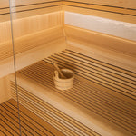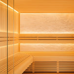 The LumenStone Auro 3 Indoor Sauna is a statement of modern wellness design. Hand-finished in pale Nordic aspen with a full tempered-glass front, it features a softly backlit stone accent wall and concealed perimeter LEDs for a calm, architectural glow. A stainless tower heater delivers authentic löyly while the floating benches create a refined, spa-quality retreat for your home.